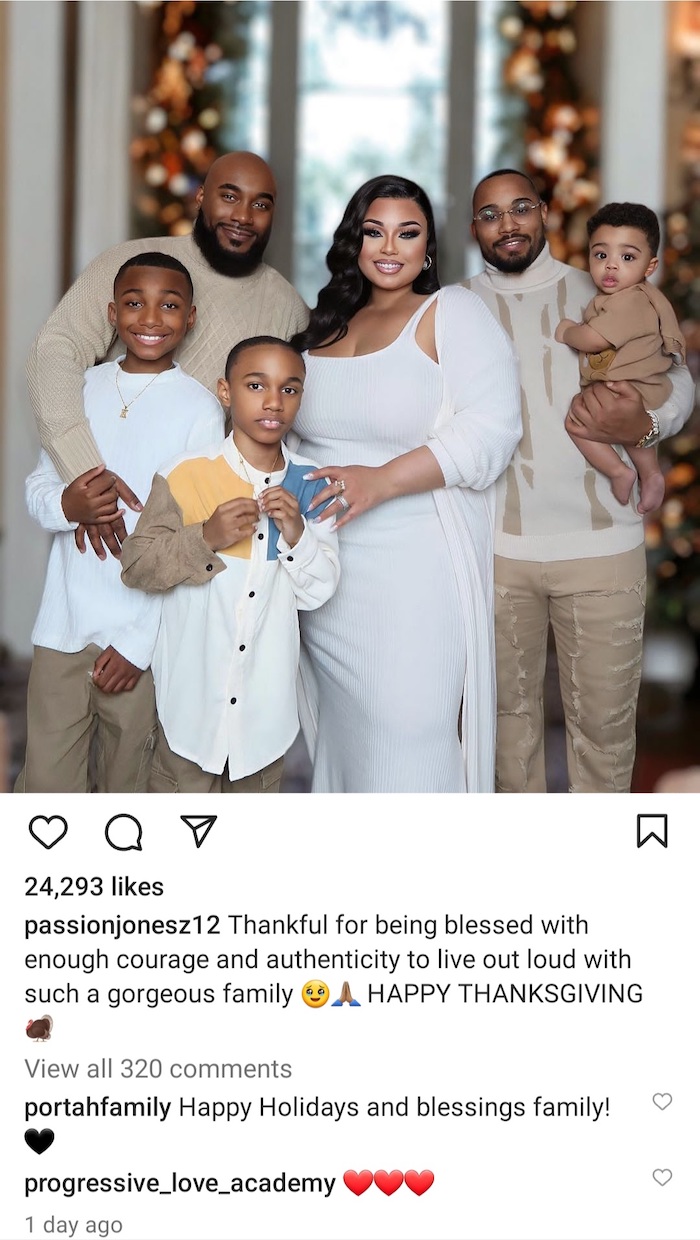 Passion Jones, a woman said to be in a polyandrous relationship has shown off her stunning family.After Thursday’s Thanksgiving in the US, the woman posed for a photo with the two men in her life and their sons.She added in the caption that she was thankful for the “courage and authenticity to live out loud with such a gorgeous family”.