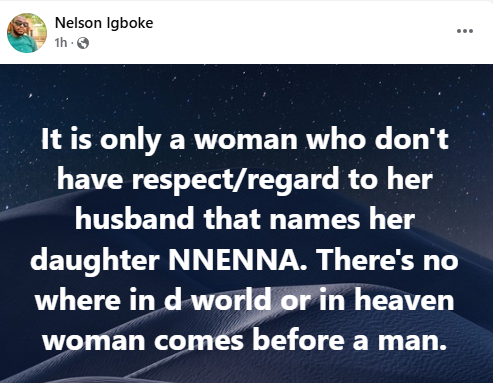 “It is only a woman who don’t have respect/regard to her husband that names her daughter NNENNA. There’s no where in d world or in heaven woman comes before a man,” he wrote.