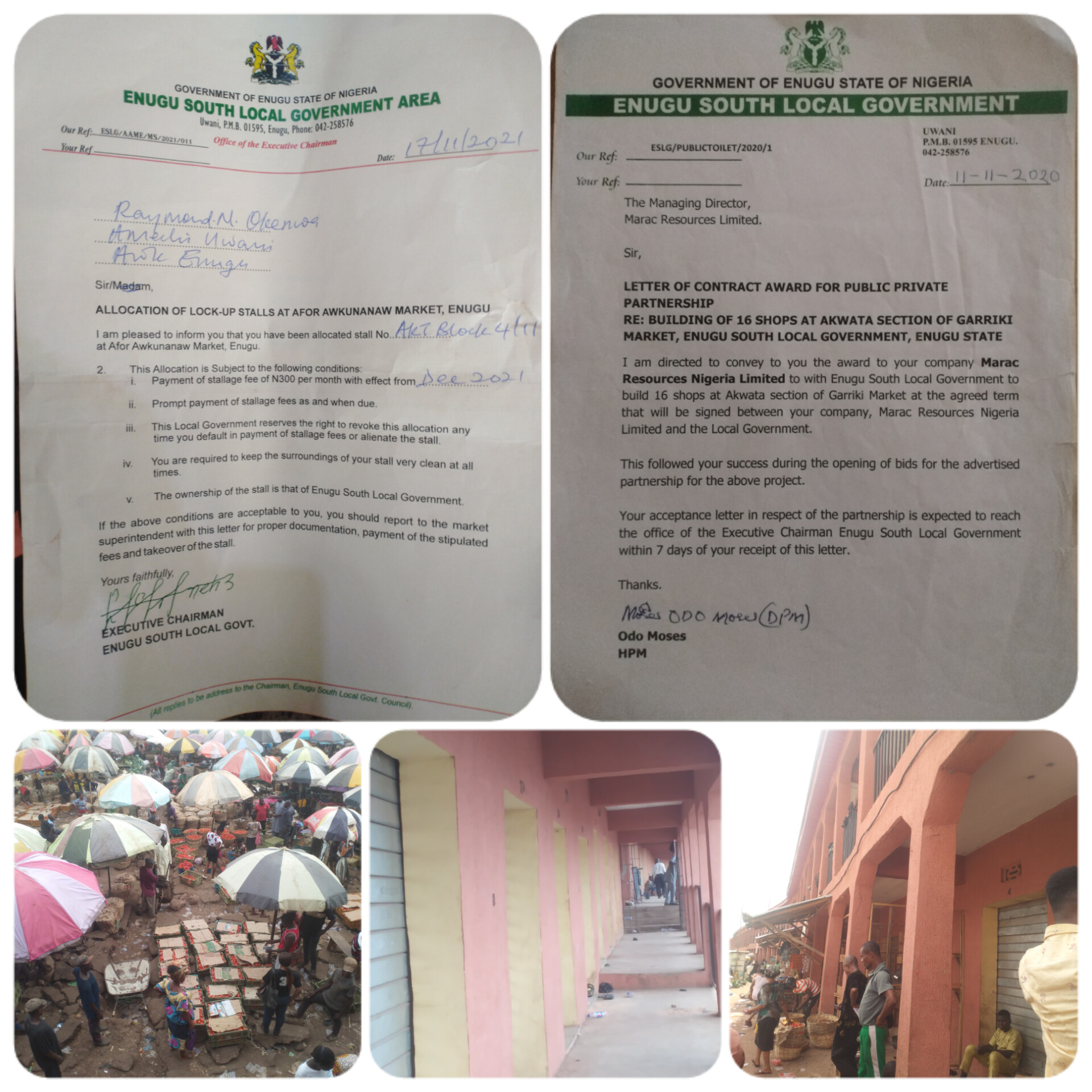 He said the Memorandum of Understanding between the Enugu South LGA and Marac Resources Limited he owned, was to build 16 shops where the developer takes 9 shops and the LG takes 7 shops.