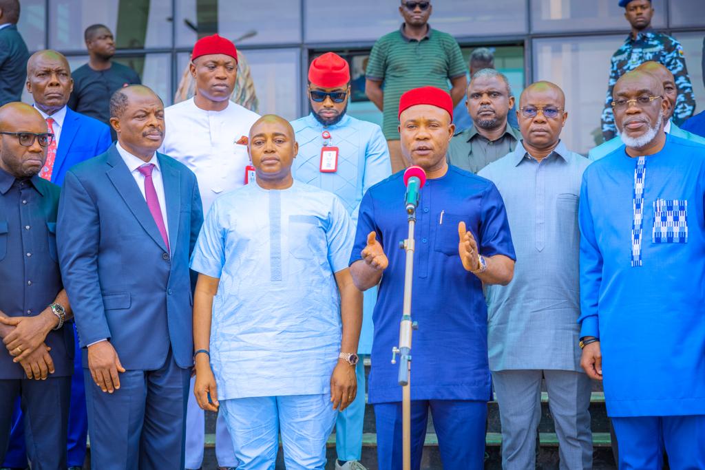 Enugu State Governor, Dr Peter Mbah flanked by members of the executive council