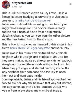 According to Facebook user, Krayzeetee Atuu, who spoke to the victim’s family members, trouble started after the suspect, also a UNIJOS student, claimed that Julius and his friend were making noise and locked Julius and his friend in his room with a padlock from outside.