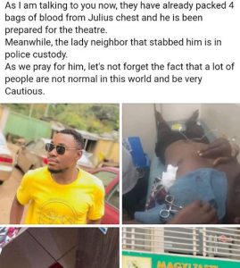 Julius Nember, a University of Jos student, is reportedly in critical condition and fighting for his life in the hospital after allegedly being stabbed by a female neighbor.